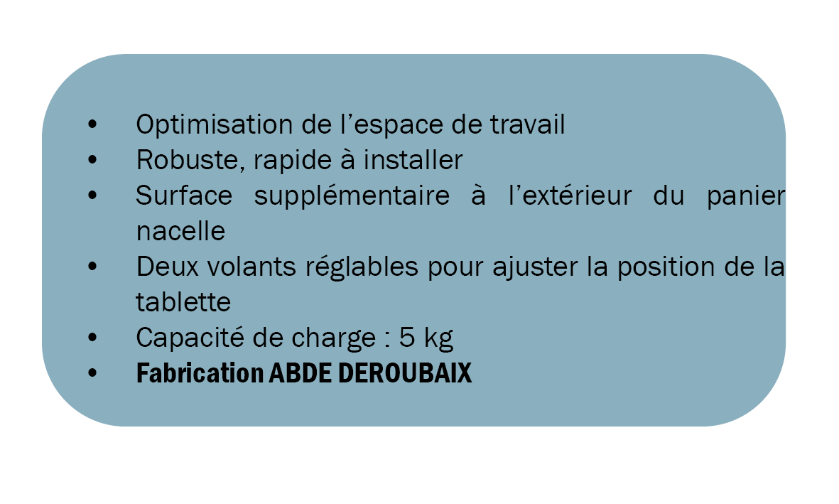 Aperçu rapide Référence: 23-0003 TABLETTE ALU POUR PANIER DE NACELLE Prix 295,50 € Ajouter au panier Détails En stock